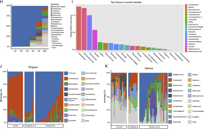 图S1。在门和属水平上优化EBC对照组、正常乳腺和乳腺肿瘤组织常驻菌群分析及菌群相对丰度,与图1和STAR方法相关